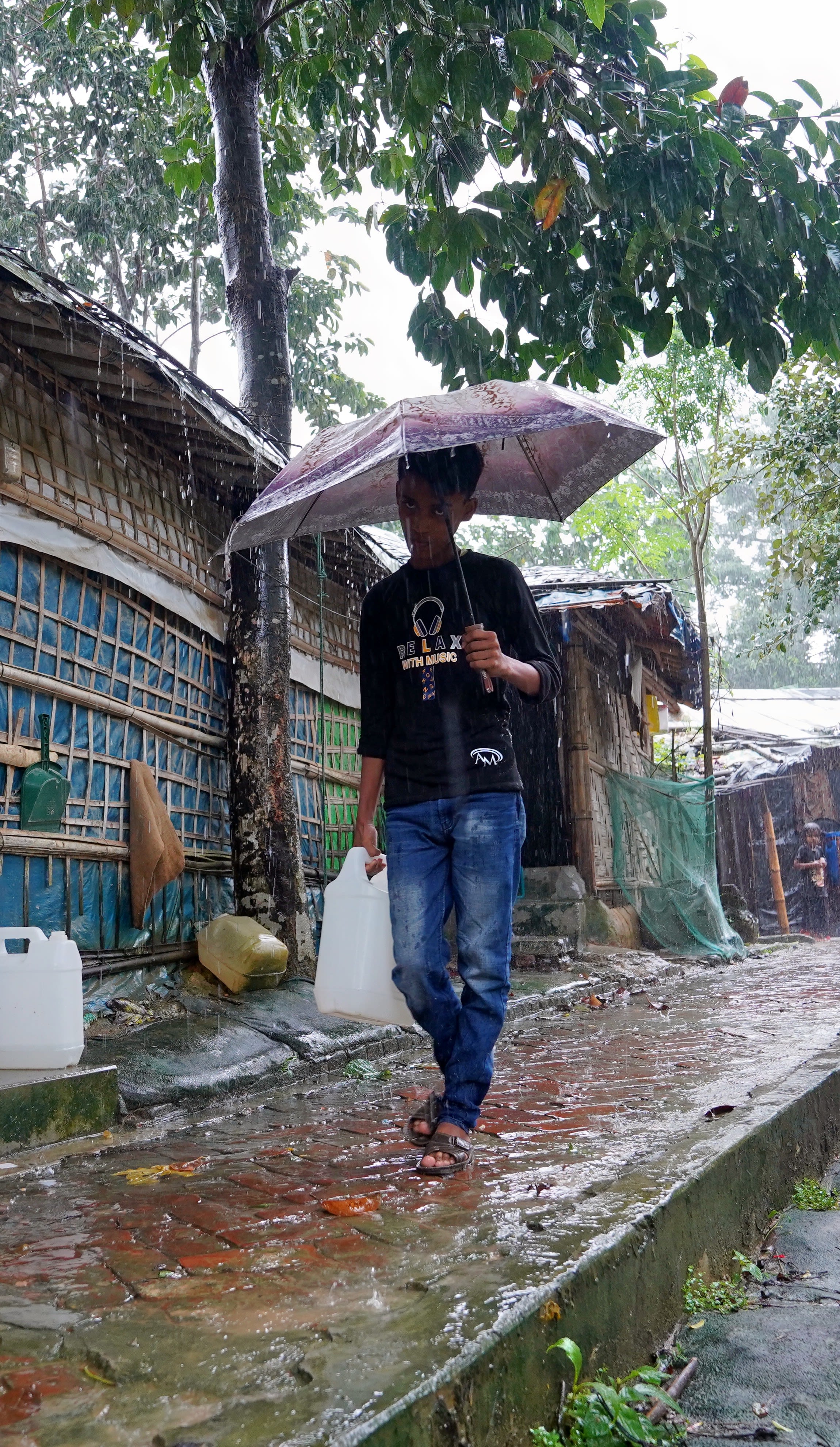 Ayaz*, 15, walking in the rain to collect water for his family in Cox's Bazar, Bangladesh. Photo: Saddam Husen / Save the Children